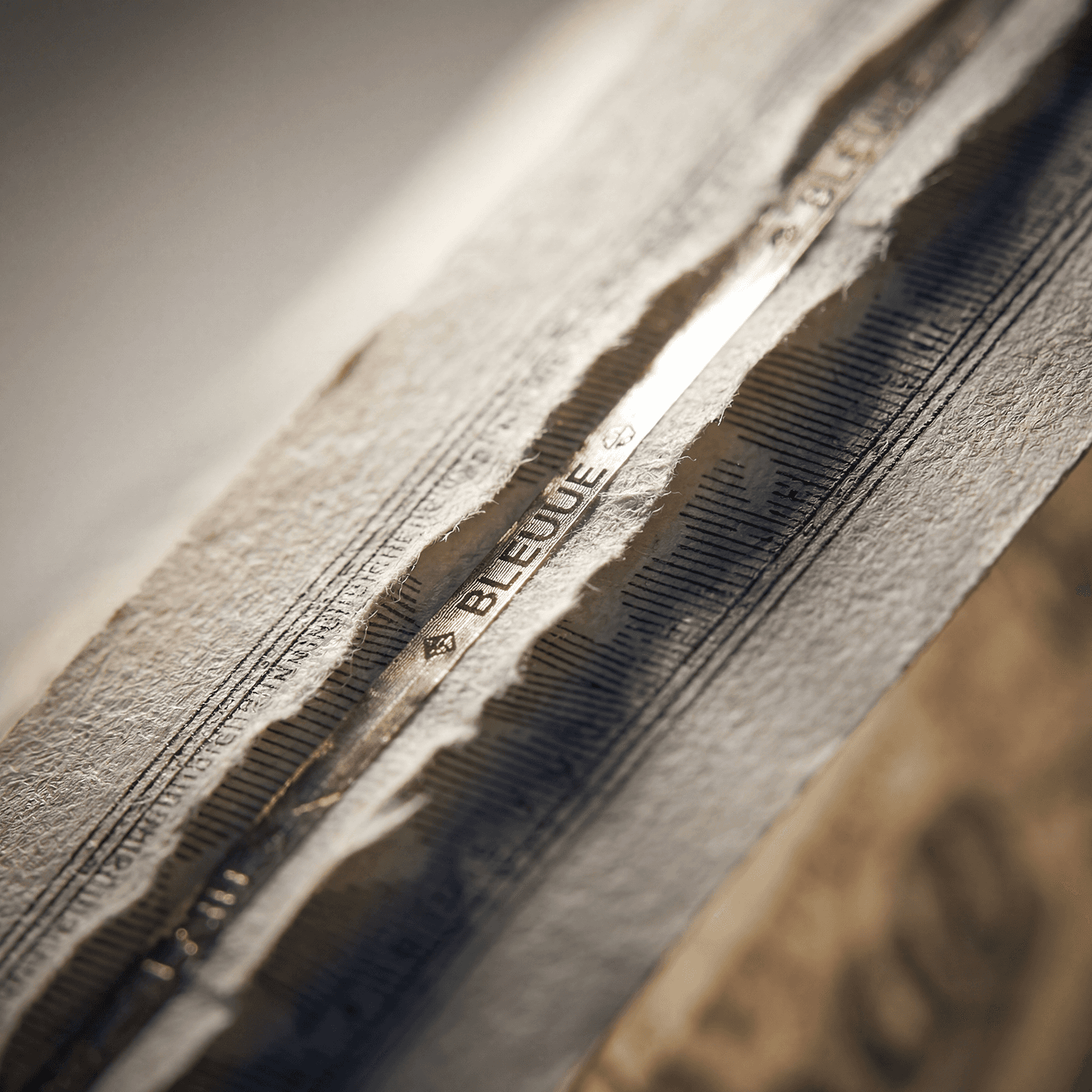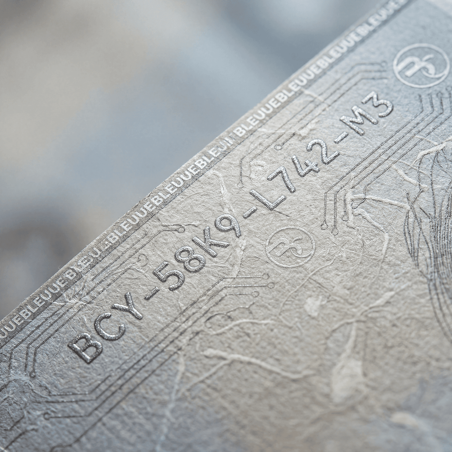 Embossing raises specific areas of the paper’s surface to create a tactile, sculpted effect. On BLEUUE Currency bills, it is applied to iconography and emblematic markings, allowing immediate authentication through touch. The dimensional depth is formed with custom dies and high-pressure stamping, enhancing both sensory recognition and anti-counterfeit integrity.