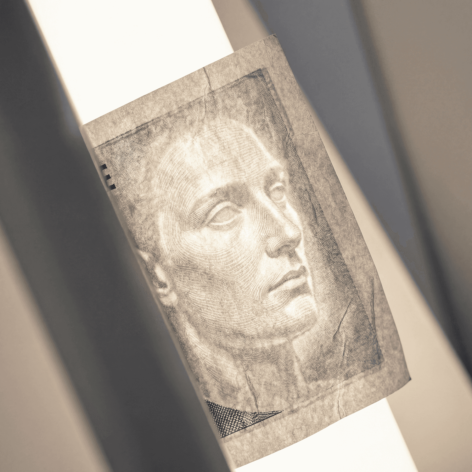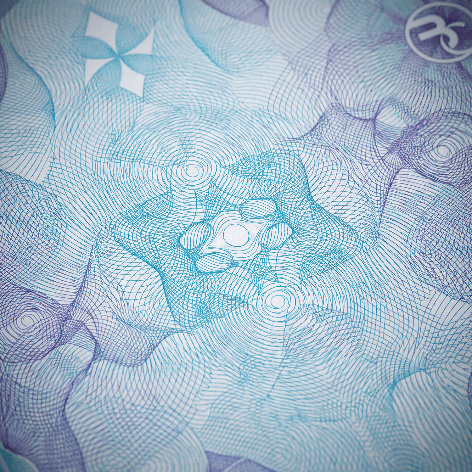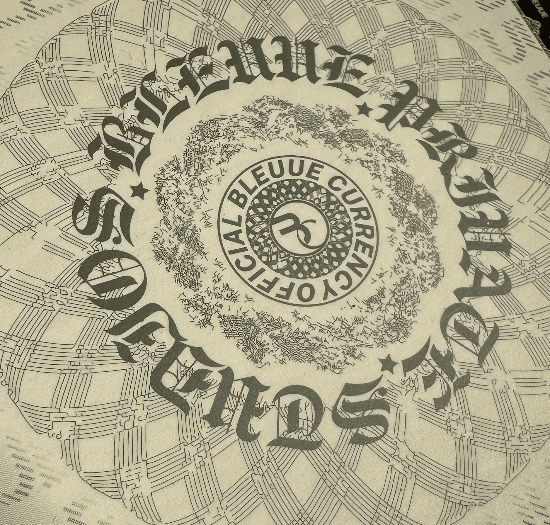 On BLEUUE Currency, these patterns integrate layered linework and latent imagery that distorts under magnification or digital reproduction. Their unpredictability resists counterfeiting attempts by embedding visual traps that shift when copied or scanned.