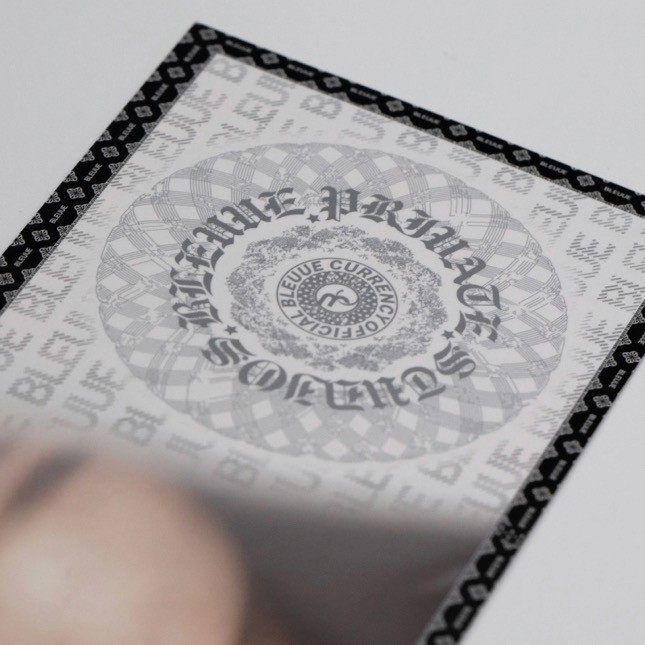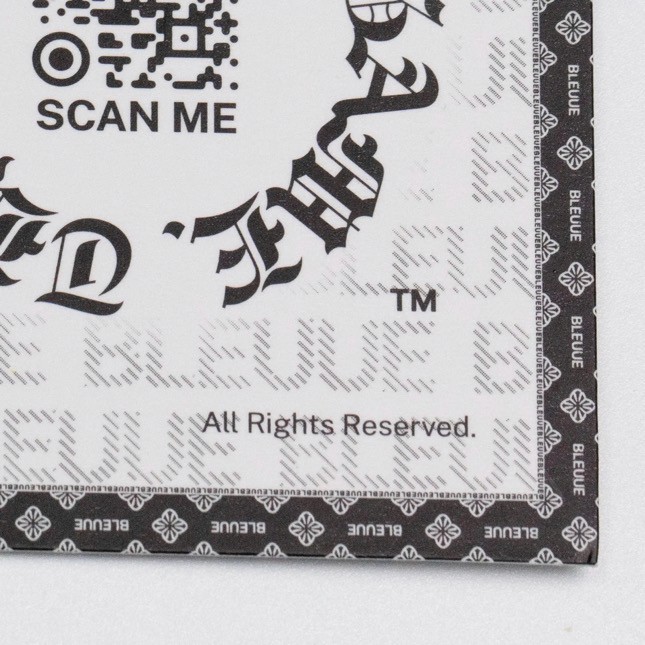 With every purchase, you receive a unique BLEUUE CURRENCY bill authenticating your product. But we also offer limited-edition themed bills, each with distinct value and advanced anti-counterfeiting features. Once sold out, these bills are never reproduced. Retaining them grants priority access to future brand developments and exclusive transactions within the BLEUUE ecosystem, bypassing the need for traditional currency. Learn more about SOME OF our advanced anti-forgery technology features below.