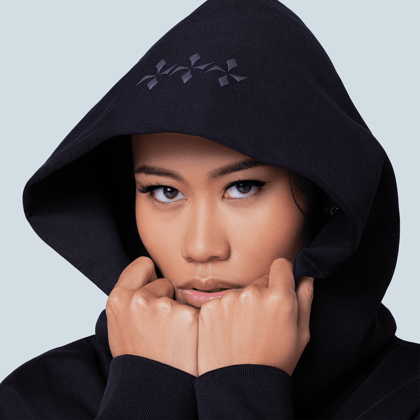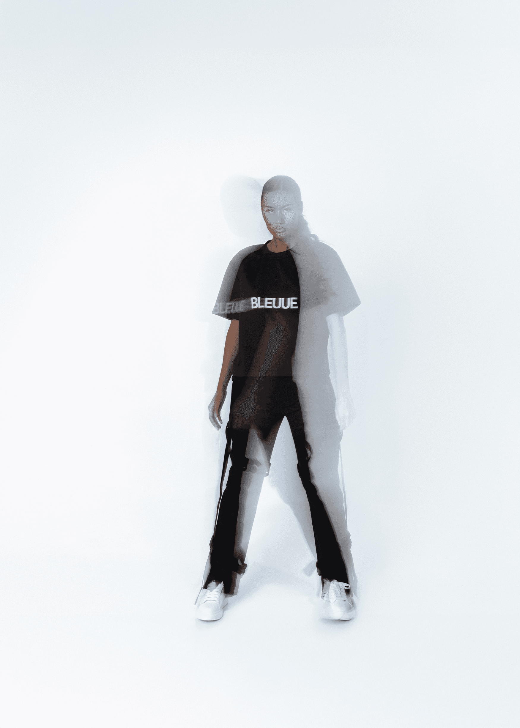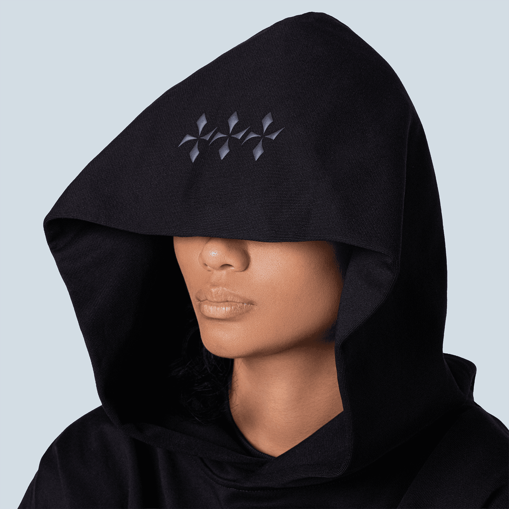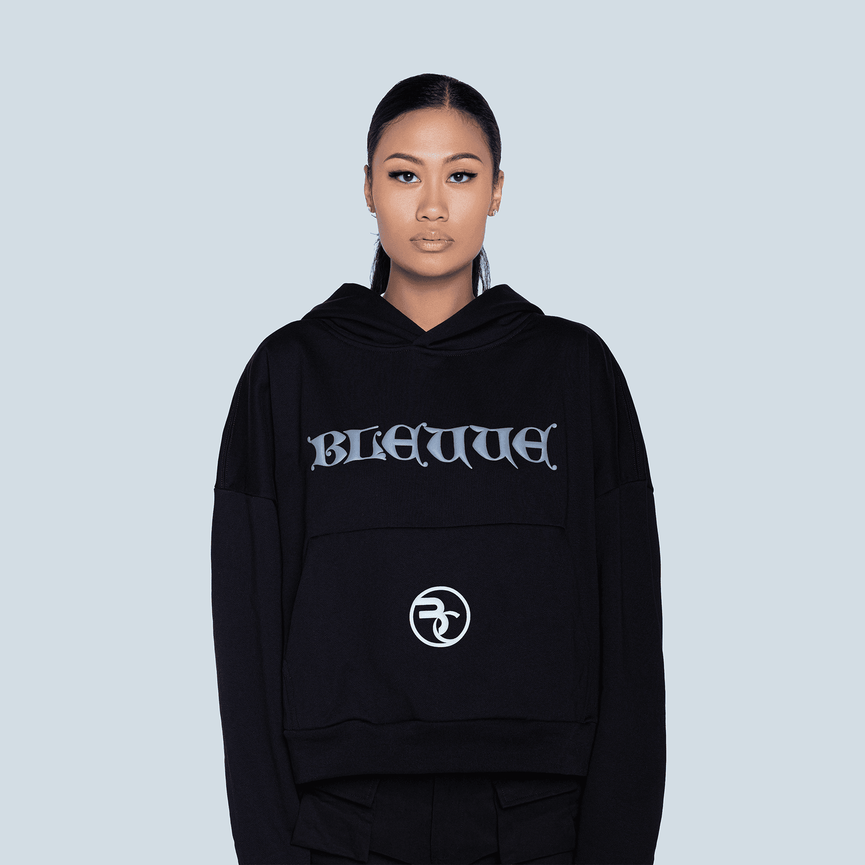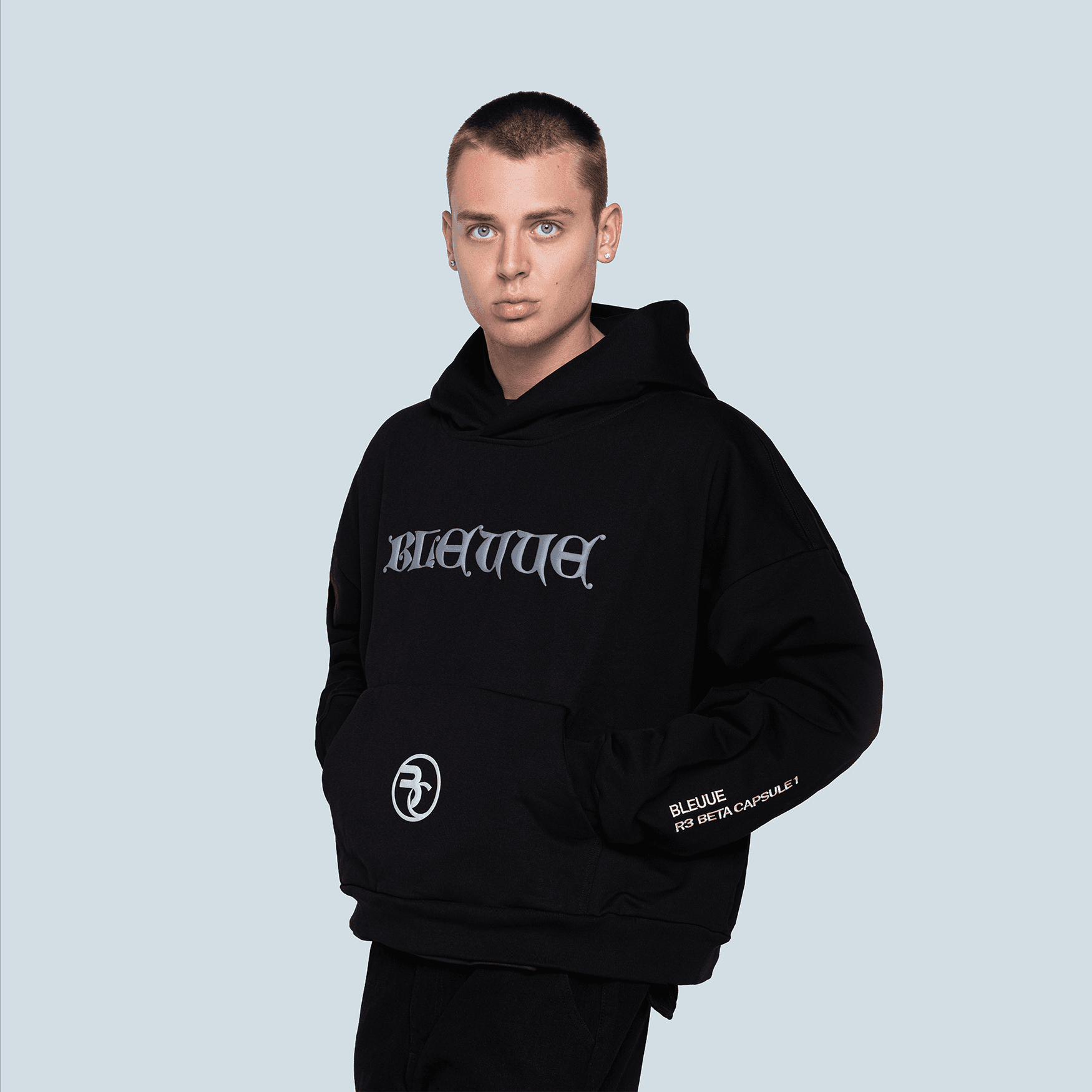 The hoodie carries BLEUUE’s classic proportions. It is oversized, boxy, symmetrical, and intentionally reserved. The hood functions both as a visual statement and a privacy visor. The body includes dimensional applications and embroidery, with the central TINAG emblem positioned above the kangaroo pocket at the centerline of the body when worn. The message is not just seen but placed where it resonates.