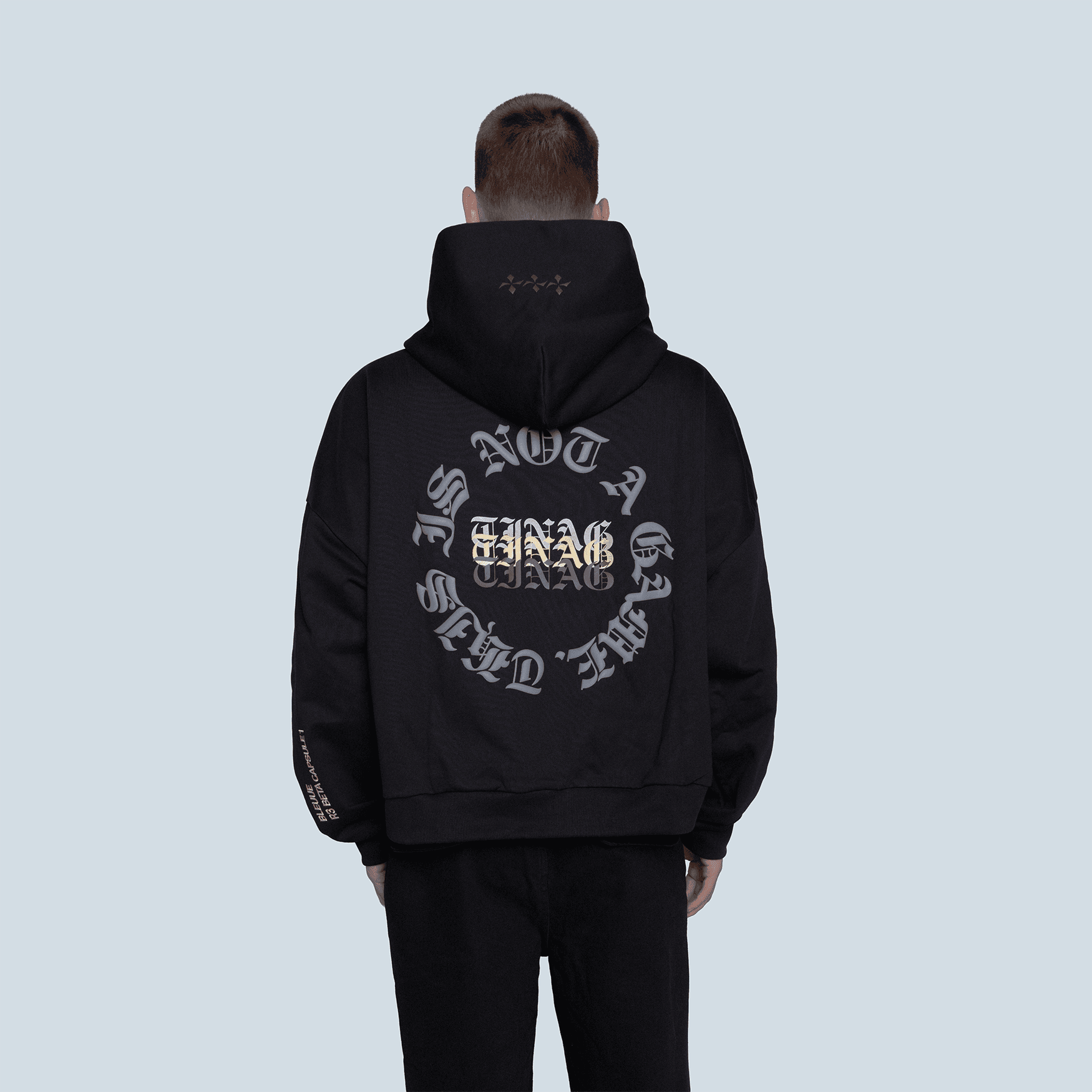 Our first release wasn’t just a hoodie. It was a signal. We opened the door to the public with what seemed like a humble garment, but beneath its surface was a system. The inaugural TINAG hoodie carried typographic codes across chest and spine, mapped into color, form, and embedded structure. It wasn’t decoration. It was declaration.